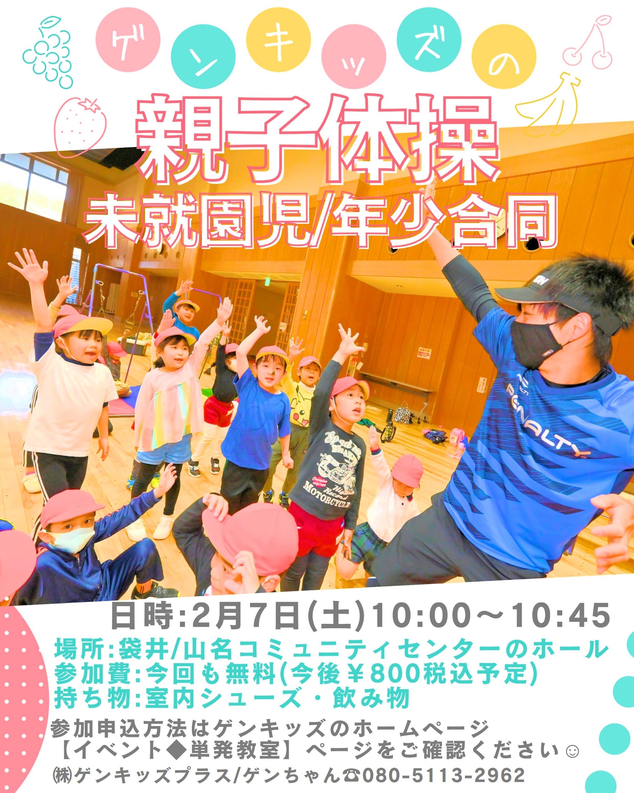 ◆2月7日(土)10:00~10:45 年少と合同開催 場所:袋井・山名コミュニティセンター 広いホール(体育館) ※今回も参加費無料 次回以降、子ども1名¥800税込予定 【参加申込方法】 ◆インスタDM ◆08051132962にショートメール ◆ゲンちゃん個人LINE ◆兄弟が入会している人は教室のLINE どれかに①~⑤を送ってくださーい! ①日にちと会場(例:〇月〇日、山名希望) ②子のフルネーム(ひらがなだけでOK) ③子の性別 ④学年(例:2歳児・年少) ⑤ケータイ番号 |