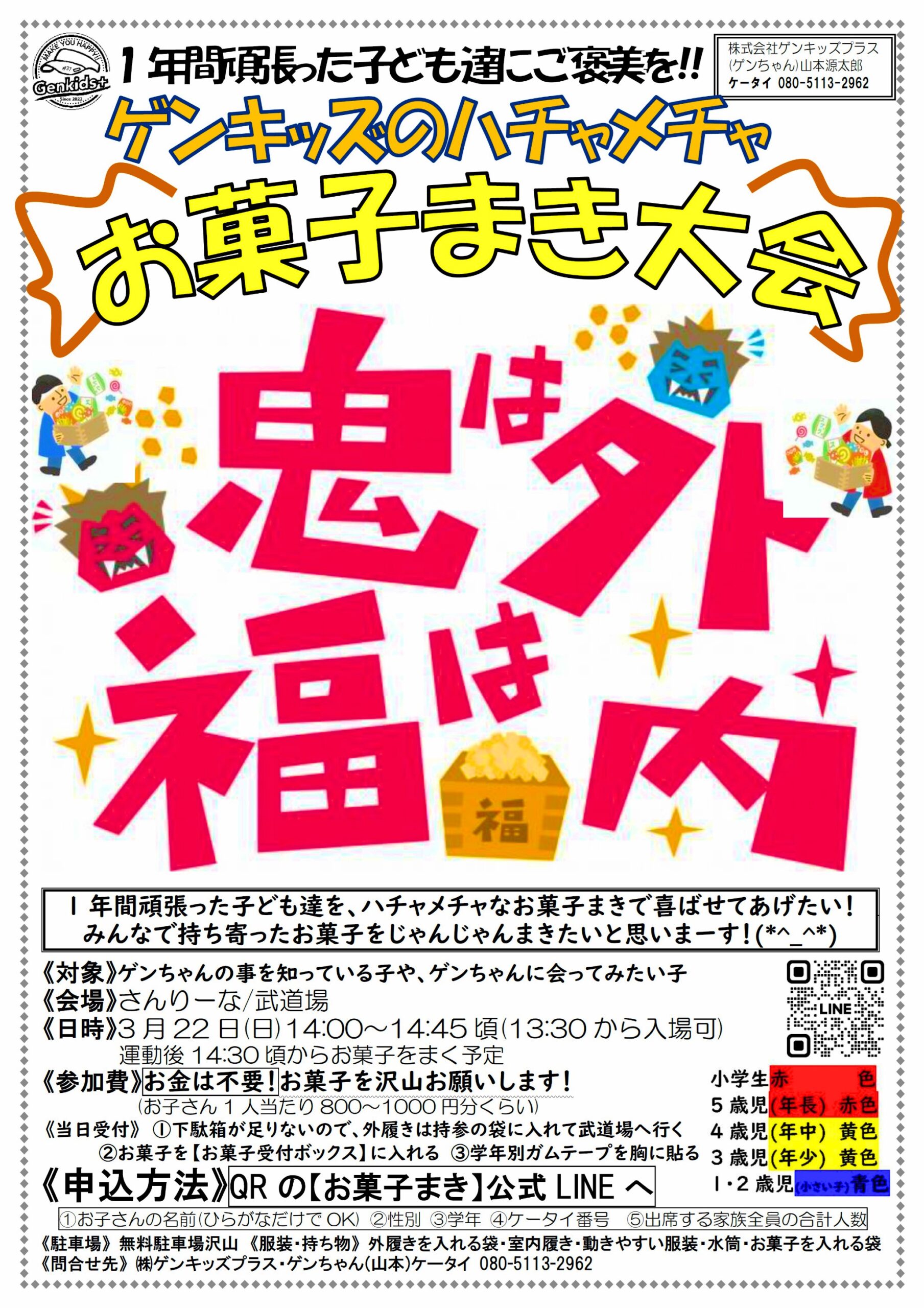 ◆2月28日(土)10:00~10:45 年少と合同開催 場所:袋井・山名コミュニティセンター 103の部屋 持ち物:室内シューズ・飲み物 ※今回も参加費無料 近々子ども1名¥800税込予定 【参加申込方法】 ◆インスタDM ◆08051132962にショートメール ◆ゲンちゃん個人LINE ◆兄弟が入会している人は教室のLINE どれかに①~⑤を送ってくださーい! ①日にちと会場(例:〇月〇日、山名希望) ②子のフルネーム(ひらがなだけでOK) ③子の性別 ④学年(例:2歳児・年少) ⑤ケータイ番号 |
